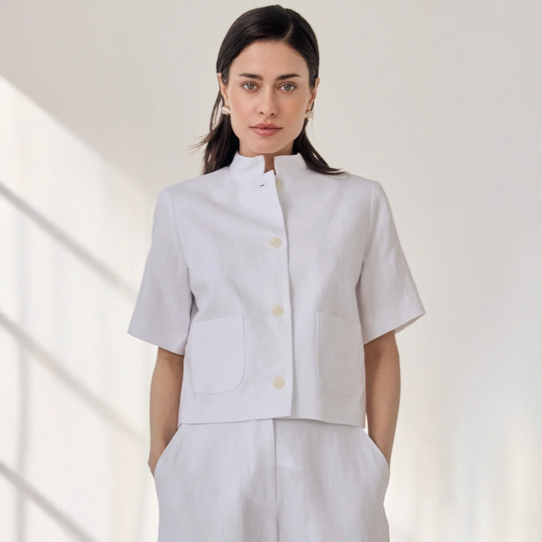 Elevate your wardrobe with our Women’s Short Sleeve Linen Jacket, thoughtfully crafted in Canada for a refined, versatile look. Designed with a boxy silhouette and a modern, structured shape, this jacket is perfect for adding a touch of effortless sophistication to any outfit. It features a round neck with a subtle, short stand-up collar and stylish rounded front patch pockets, blending classic design with contemporary details.