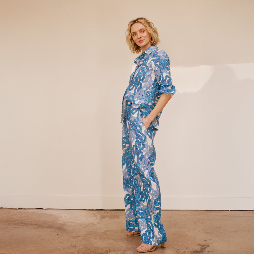 The Infinite Chains print is inspired by the chains found at marinas, adds a unique and symbolic element to the collection. These chains not only evoke imagery of seaside life but also lend a touch of sophistication. Cut in our newest pant style, the Resort Pant is a flat front with a zip fly closure and side slash pockets. Wear these with the  Infinite Chains Classic Linen Shirt for a matching set look.